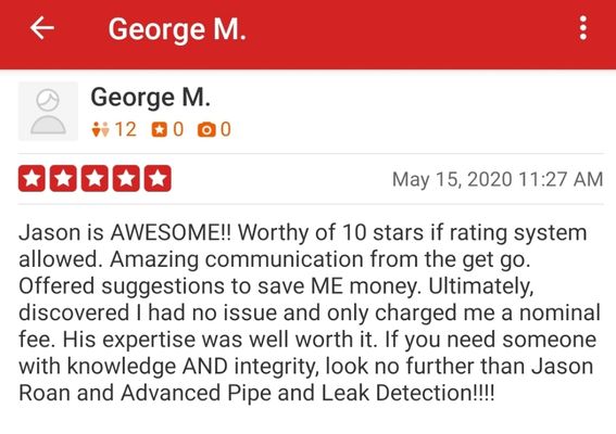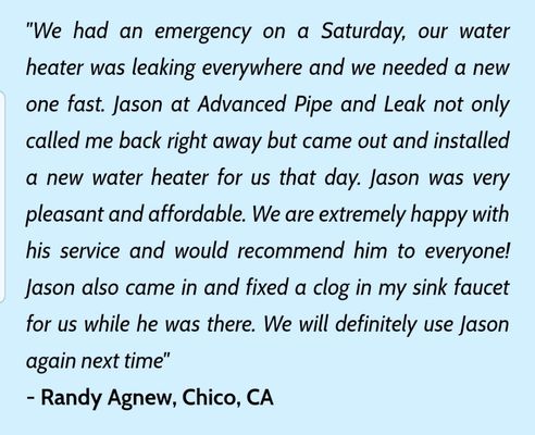 I highly recommend Jason for any of your suspected slab leaks. He was thoughtful, thorough and great at finding the leak. We were very concerned about a leak that we knew was coming from under the slab, but obviously couldn't find it. After calling numerous people he was the only one that would come out on the weekend. He drove all the way from Chico to the Yuba Sutter área. He marked were the leak was coming from and once my husband broke the tile and slab we saw it clear as day what pipe was punctured. Thank you Jason for finding the leak. He was very kind and gave us an awesome price! He was quick and efficient.