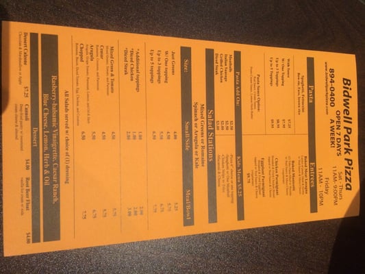Bidwell Park Pizza is a brand new pizzeria in east Chico. We offer calzones, salads, sandwiches pasta, and delicious desserts. And, of course, pizza. All of our menu items are inspired by Chico's own - beautiful Bidwell Park. We offer custom and traditional Neapolitan pizza, fresh salads (kale, arugula, Cesar