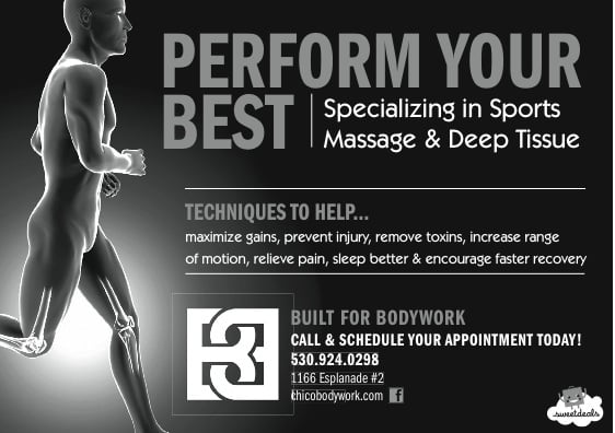 Ben with Built For Bodywork has been serving the Chico community for over four years working with Spine Chiropractic, Sierra Nevada Brewery, Chico State WREC, and many other businesses, gyms and athletic groups and teams.