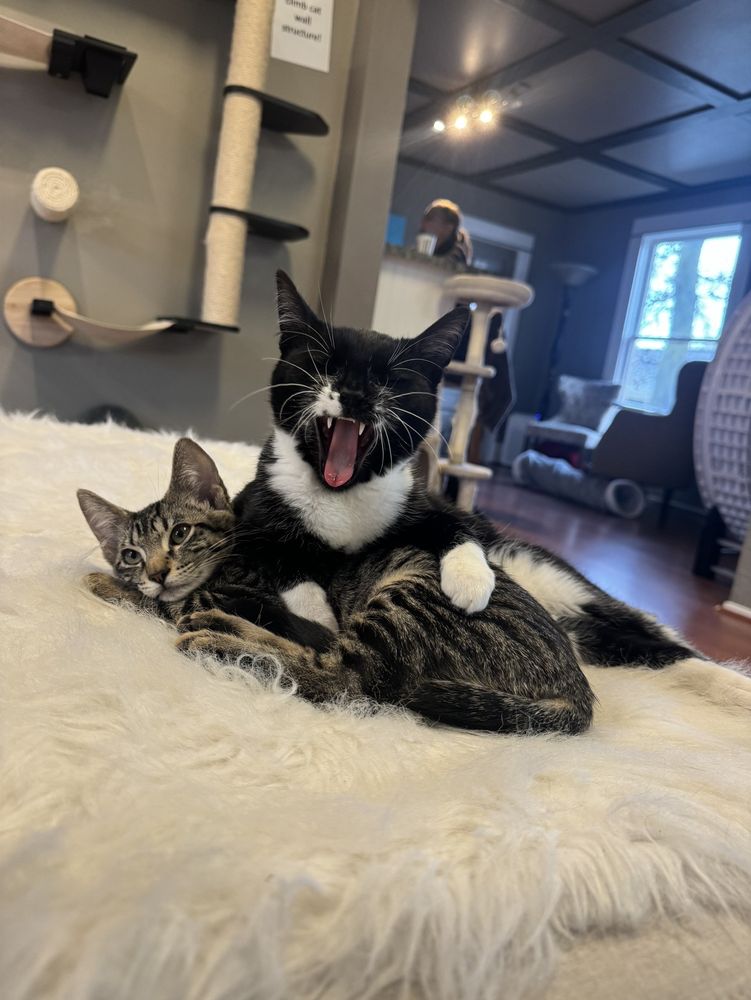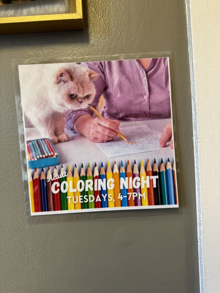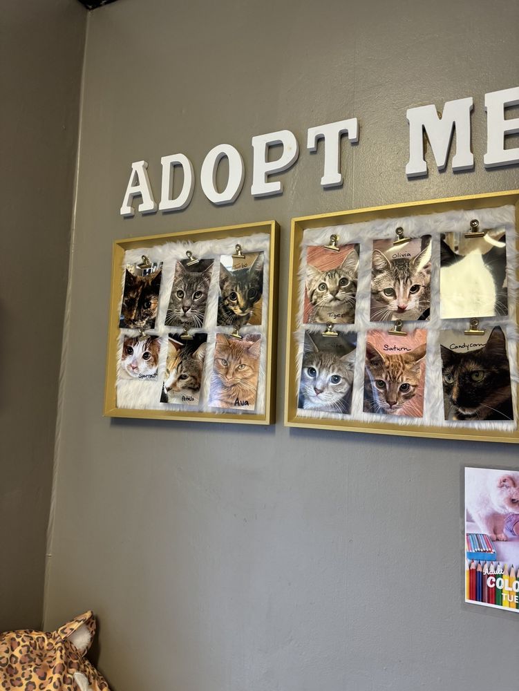AMAZINGGGG extremely nice and relaxing little place to come hang out with the cutest most adorable kitties!!!! They have kittens and adult cats all for adoption! Theres also a bio book there with little info about all the cats and their rescue stories! There's drip coffee, sodas, snacks, and some drinks for anyone 21+! Everyone who worked there was super friendly! Prices are about $10 for an hour for students and you reserve online! I loved it so much I definitely plan to come more often