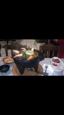 The Molcajete, an amazing dish that has has pork, chicken, prawns, beef, onions, cactus, bell pepper, cheese. Includes a side of rice & beans and served with tortillas, typically a dinner for two. The Super Burrito, get everything in your burrito (guacamole, sour cream, cheese, rice & beans, salsa, and
