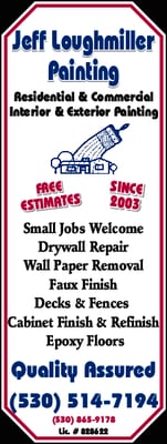 Expert Consulting & free estimates. Residential & Commercial; Interior & Exterior Painting. Small Jobs Welcome; Drywall Repair; Wall Paper Removal; Faux Finish; Decks & Fences; Cabinet Finish & Refinish; Epoxy Floors; Roof coatings; metal buildings; elastomeric water proofing; wood siding stain & re-stain. Virtually all phases of Residential and Commercial Painting. Serving the greater Chico Ca area, Including Butte, Glenn and Tehama Counties