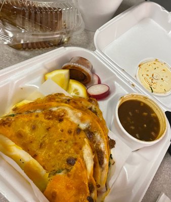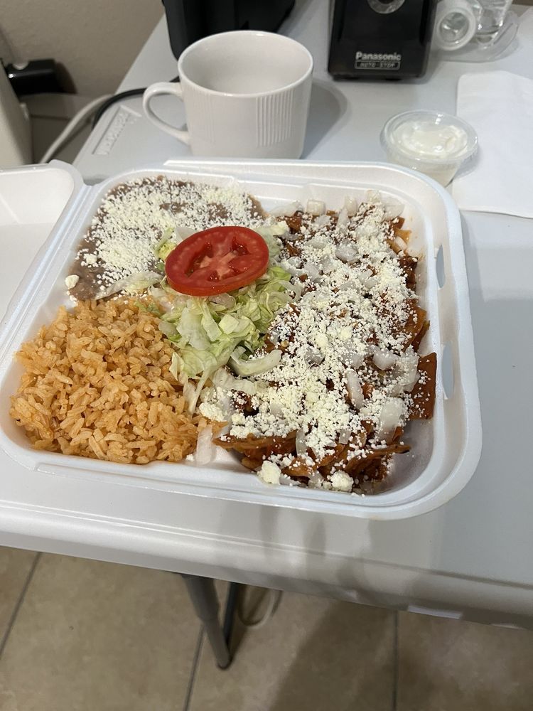 Chilaquiles were good, I took a 14 min walk back before I ate it and the tortillas got soggy, some still had a little crunch to them. They gave option between spicy or mild. Mexican spicy is a bluff, its spicy but its really not all that. So I ordered spicy and yeah a little spice nothing I cant handle. I like how easy it is to pick up with fork, you can pick like 4 pieces in one stab (yes this is my first time chilaquiles). Rice and beans were great as always. Rice and beans never miss. Tomato was surprisingly red, but nothing outstanding besides the color. I ordered takeout, I think they do give you playes if you order dine in. My Chilaquiles came with white sauce I assume to be sour cream.