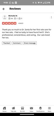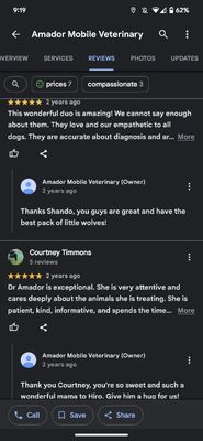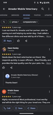 Sonia and John were awesome. THey came to my house and helped my very elderly dog pass over to doggie heaven. Not stressful or fearful for him. I highly recommend doing this in your own home. They were very kind and very professional and they took care of EVERYTHING. I have told everyone I know with pets about them. They came back the following week and cleaned my other dogs teeth and did her nails..very unstressful for all of us. Again I HIGHLY RECOMMEND!