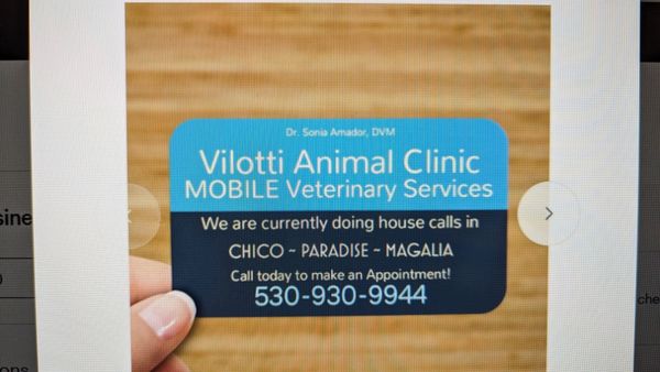 Just relocated to Chico! Offering small animal MOBILE Veterinary services. We do House Calls in Chico, Paradise, & Magalia. We can perform all services in the comfort of your own home, with the exception of major surgeries and x-ray. Please check out our website for more details and call us today to schedule an appointment. We look forward to taking care of your four legged family members!